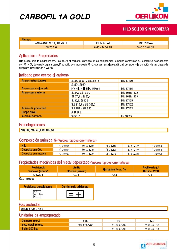Hilos sólidos indicados para la soldadura de los aceros no aleados y los aceros al carbono. Hilo para soldaduras de responsabilidad, excelentes características mecánicas.
